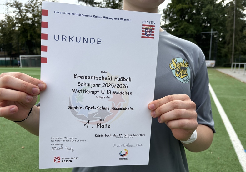 Am Mittwoch, 17. September, nahmen sieben motivierte Schülerinnen der Sophie-Opel-Schule am U18-Fußballwettkampf im Rahmen von „Jugend trainiert für Olympia“ teil. Das Turnier fand bei bestem Wetter auf dem Kunstrasenplatz im Sportpark in Kelsterbach statt.